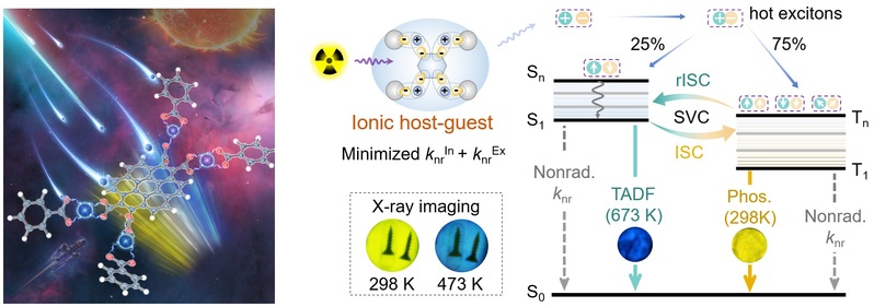 Recently, the research team of Professor Zhao Weijun and Academician Zhu Weihong from the School of Chemistry and Molecular Engineering, ECUST, has made important progress in the research of ultra-high temperature organic triplet scintillator, and the related research article was published in the Journal of American Chemical Society under the title of “Organic Ionic Host–Guest Phosphor with Dual-Confined Nonradiation forConstructing Ultrahigh-Temperature X-ray Scintillator”.